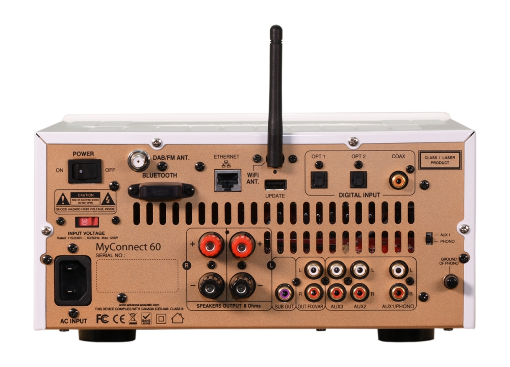 Mit drei analogen Aux-Eingängen können externe analoge Quellen, wie z.B. ein Plattenspieler mit MM-Tonabnehmer, mühelos angeschlossen werden. Der interne D/A-Wandler ist mit einem Wolfson WM8740 Chip ausgestattet und unterstützt hohe Auflösungen von bis zu 24 Bit/192 kHz. Damit verfügt der MyConnect 60 über drei digitale Eingänge, einen koaxialen und zwei optische, an die zum Beispiel ein Fernseher angeschlossen werden kann. Die Steuerung der Advance Playstream-Funktionen erfolgt ganz einfach über eine App für Android und iOS, die für Tablet und Smartphone verfügbar ist. Für andere Funktionen steht eine praktische IR-Fernbedienung zur Verfügung, mit der auch Radiosender gespeichert werden können.