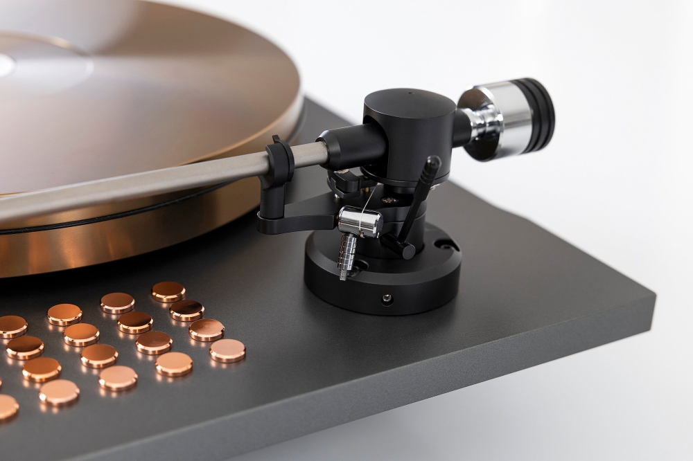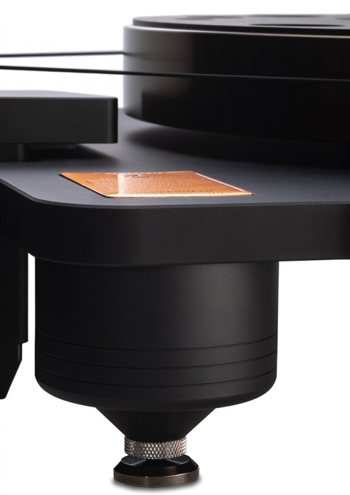 Die Basis des Plattenspielers besteht aus einer 16 mm starken Aluminiumplatte mit abgerundeten Kanten und mattschwarzer Eloxierung. Eingelassene Kupferelemente – insgesamt 28 Stück – sorgen für eine gezielte Resonanzdämpfung. Eine elegante Kupferplakette mit Modellbezeichnung ziert die Front. Optional lässt sich ein zweiter Tonarm bis zu einer Länge von 10,5 Zoll integrieren. Drei höhenverstellbare Spikes gewährleisten einen sicheren Stand und eine wirksame Entkopplung vom Untergrund.