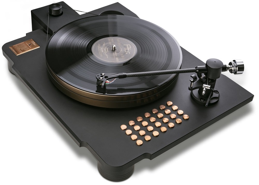 Die Basis des Plattenspielers besteht aus einer 16 mm starken Aluminiumplatte mit abgerundeten Kanten und mattschwarzer Eloxierung. Eingelassene Kupferelemente – insgesamt 28 Stück – sorgen für eine gezielte Resonanzdämpfung. Eine elegante Kupferplakette mit Modellbezeichnung ziert die Front. Optional lässt sich ein zweiter Tonarm bis zu einer Länge von 10,5 Zoll integrieren. Drei höhenverstellbare Spikes gewährleisten einen sicheren Stand und eine wirksame Entkopplung vom Untergrund.
