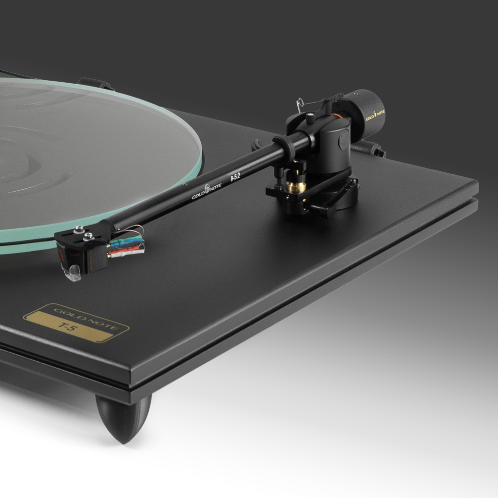 Er ist in elegantem Schwarz lackiert und wird mit dem bewährten B-5.2 Tonarm und der abnehmbaren Staubschutzhaube aus transparentem Acryl geliefert. Wie alle Plattenspieler von Goldnote wird auch der T-5 in Italien mit Liebe und Sorgfalt von Hand gefertigt.